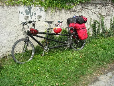 Das war unser letzter Trip, den wir im Sommer 2005 unternommen haben - wir waren fest entschlossen, nach einem Jahr "Zwangspause" wieder Fahrrad-Urlaub zu machen und da bot sich mit der Kleinen die Lösung "Tandem"an. So haben wir uns entschlossen, unserem alten Dawes-Tandem noch einen Partner an die Seite zu stellen: beim Radhändler unseres Vertrauens sind wir im Herbst 2004 überraschenderweise fündig geworden. Eigentlich baut der nämlich keine Tandems, aber da hat ihn wohl die pure Lust überkommen. Das gute Stück erlaubt es, dass auch Kinder bequem hinten sitzen können, wenn sie nur über 1,30 m sind...